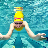Camera shot of woman in swimming costume from below