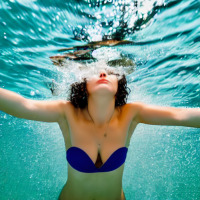 Portrait of a woman in a swimmingsuit, taken with a camera from below.